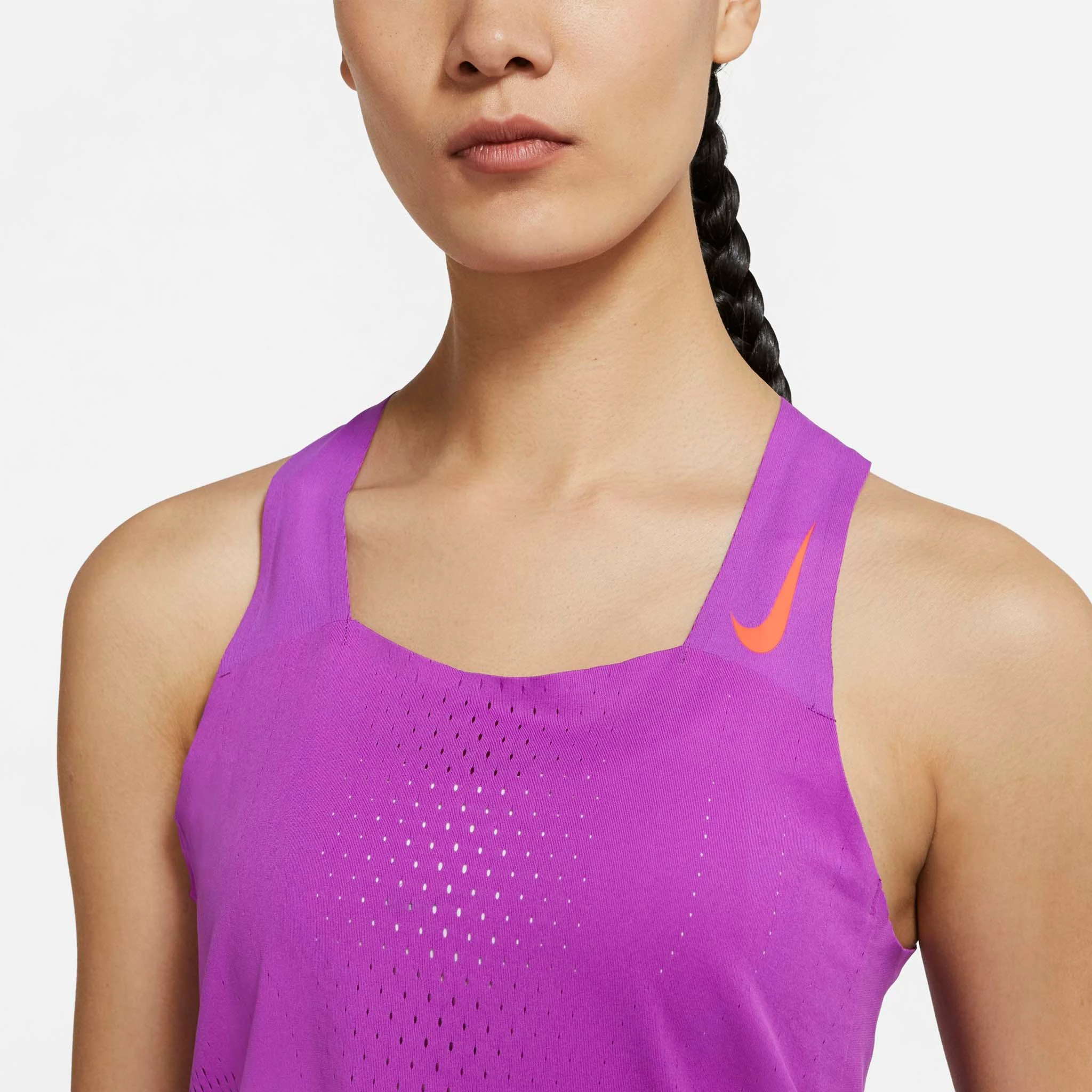 Nike Aeroswift technology integrates innovative features and materials with a precision fit. This delivers exceptional mobility and lightweight comfort to help you perform at your best. The knit fabric combines with mesh for optimal cooling, while additional sweat-wicking technology helps you to stay dry and comfortable. The racerback design of the singlet also allows you to move freely without distractions.